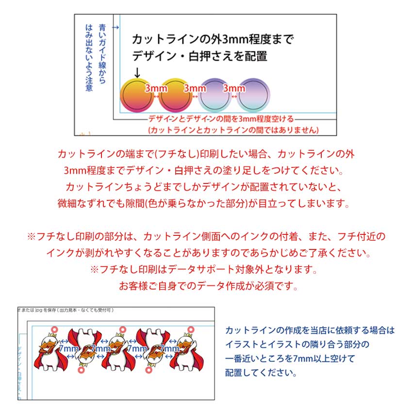 データに塗り残しがある場合や、不鮮明な場合は白押さえ・カットラインが作成できないため、データの修正をお願いすることがございます。