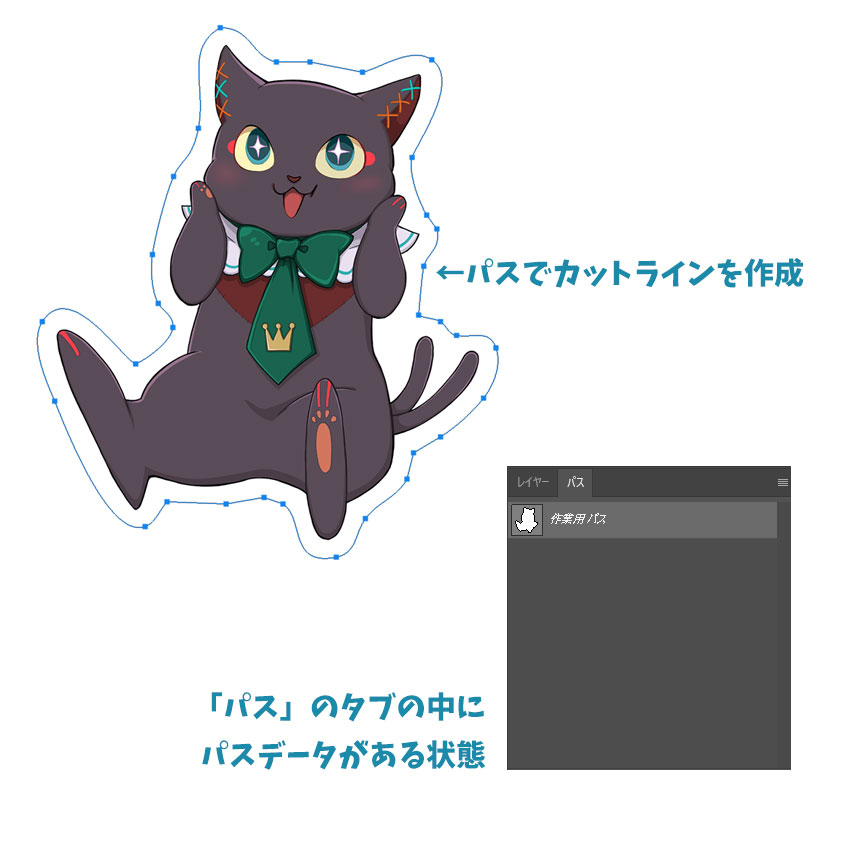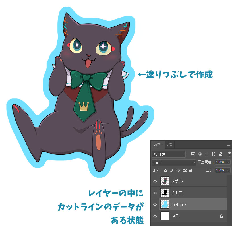 塗りつぶしでカットラインを作成する場合は、白押さえとの混同を防ぐため、必ず黒以外で塗りつぶしてください。