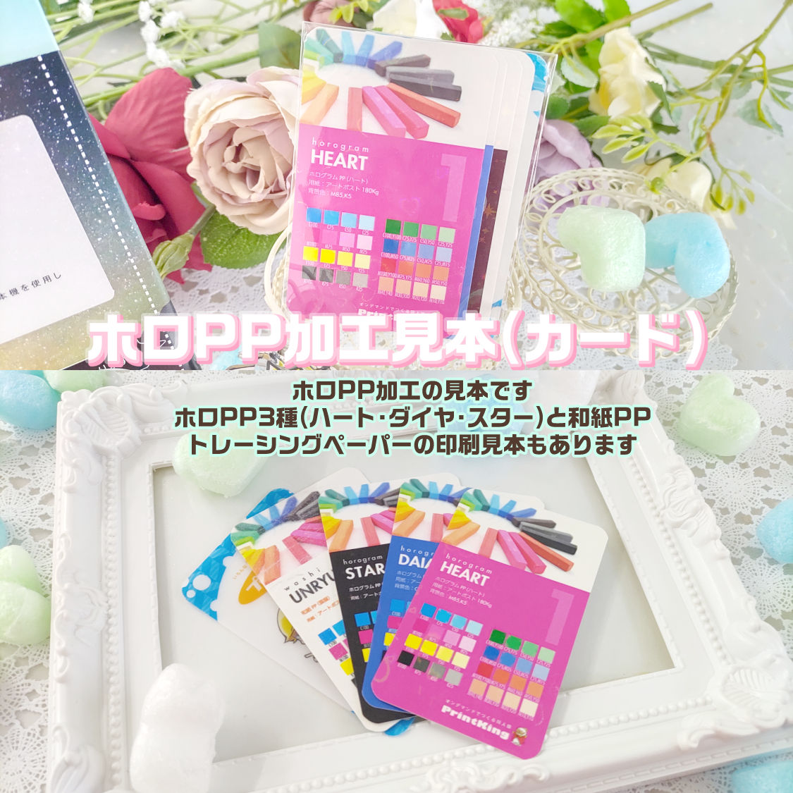 各種ホログラムPP/和紙PP加工を施したカードを封入しています。
